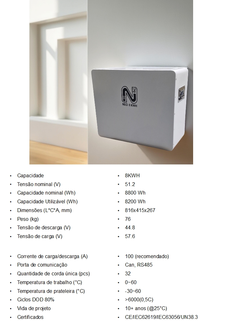 Inversor Growatt 6KW e Bateria NEO Pro 8KWH Células de Qualidade CATL com comunicação Can