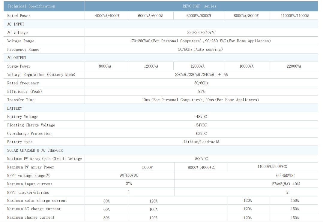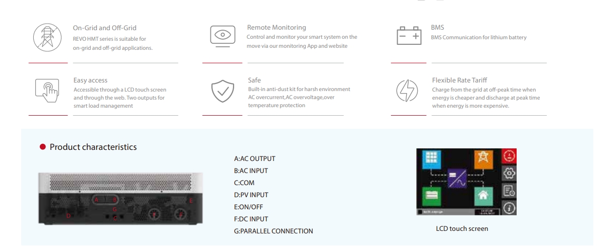 Características principais:1. On-Grid e O-Grid: A série REVO HMT é adequada para aplicações on-grid e fora da rede